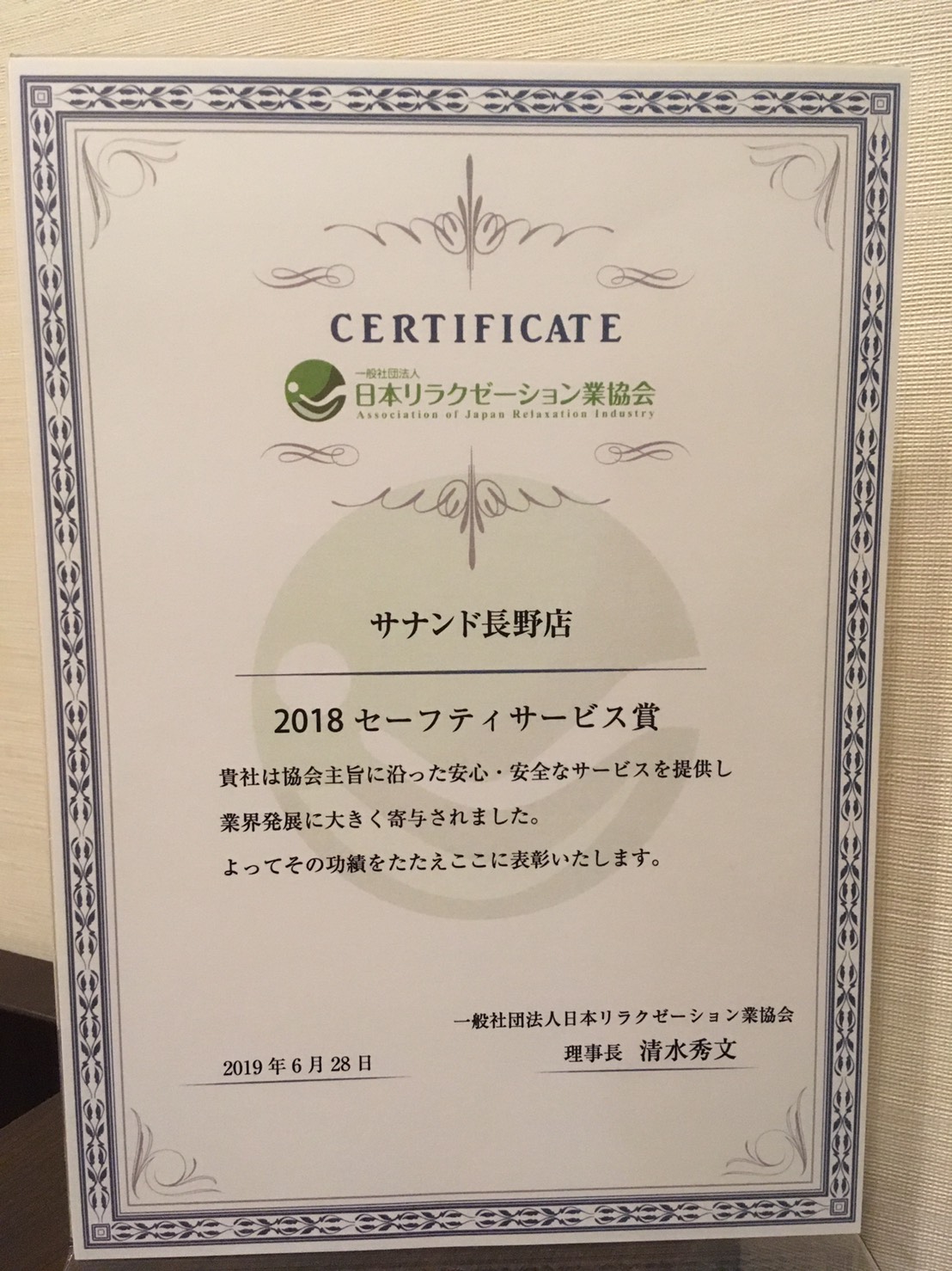全国に約2300店舗ある「日本リラクゼーション業協会」の認定スペースの中で、最も事故がなく安全なサービスを提供するお店として評価されました。